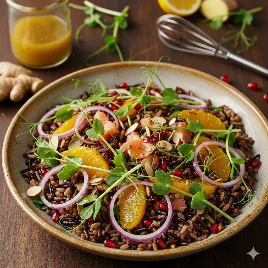Add Microgreens: Add the Pea Shoots and orange/pomegranate. Drizzle the remaining dressing and toss very lightly just until the pea shoots are coated, careful not to crush them. Serve immediately.